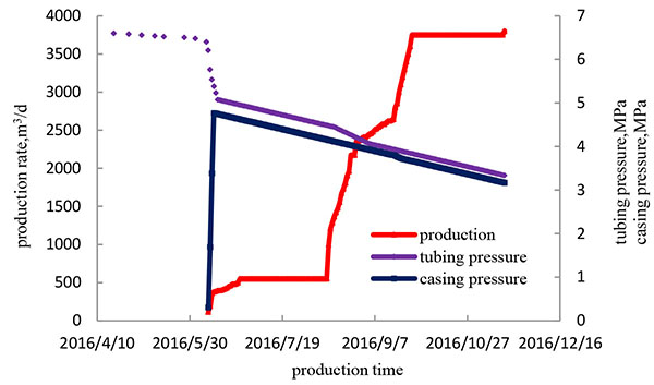 In Qinshui CBM basin, well No. QS 40-8 was fractured as above stimulation design theory and method. The treatment zone is shown in Fig. (8), and actual fracturing curve is Fig. (9). The fracturing process is divided into three cycles. In first cycle, after the fracture is opened, extended and connected, then pumping is shut down and the pressure is unloaded. After half an hour, fracturing treatment began again, and sand concentration was raised smoothly. When pressure rose drastically, sand pumping was stopped, and repeated several times. During the treatment, micro-seismic wave was monitoring in the nearby well No. QS 40-9, and the result (Fig. 10) showed that complex or network fractures were formed. The evaluation of the micro-seismic invasion demonstrated that the width of network fracture is 75 m, and the length is 420 m. Furthermore, the production rate testified that the fracturing result was better than the conventional method. After half five months later, the CBM production was nearly 4000 m3/d, which exceeded the average production by a factor of 4 (Fig. 11).