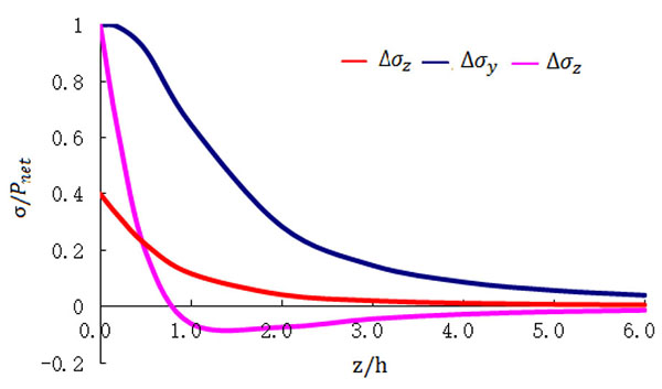 The net pressure in hydraulic fracture affects largely the around stress, especially in the direction of fracture cross section. If the fracture is longer, and the net pressure keeps almost same, which only changes at the fracture tip, and stress induced by the opening of hydraulic fracture is shown in Fig. (1).