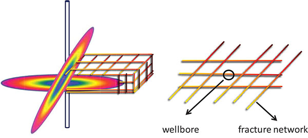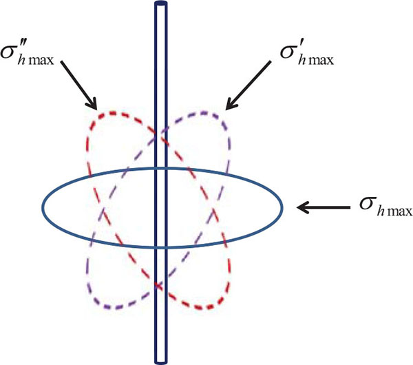 Fractures always extend perpendicular to the local minimum stress direction, and induces stress around nearby areas, which can be used to creat another fracture. The hydraulic fracturing period can be divided into different parts: first injection, stop and wait, then second injection and so on. Taking advantage of the stress alteration caused by the first hydraulic fracture and after a short delay, creating another fracture will be effective. If the the process is repeated several times, the stress alteration can be used to create fractures in multidirection (Fig. 6), therefore, the SRV and drainage will be larger than the bi-wing conventional fracturing method.