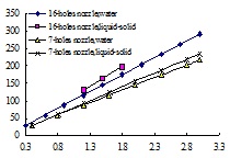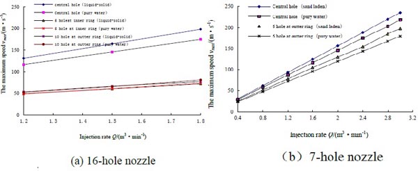 When the working liquid is water and liquid-solid two-phase, with numerical simulation software, we simulated the maximum flow velocity of each hole in 16-hole and 7-hole bits' at different injection rates and get the curve between the maximum speed and the injection rate, which is shown in Fig. (3).