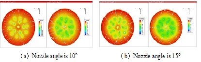 As shows in Fig. (4), by comparing the speed of jet section in center hole and the speed, shape of jet section at the distance of 5mm away from the center hole, when nozzles tilt at angles of 10° and 15° we find the cross section configuration of jet flow to be more regular than others. However, when the nozzle tilt at an angle of 15°, the thickness of nozzles' thread will be reduced and its strength cannot meet the requirements. When the tilt angle is 10°, the maximum speed at central nozzle is the largest, reaching 180m/s, while in the direction of cross Y at the distance of 5mm away from the outlet section of the central nozzle, the maximum speed is 110m/s, at this moment, the efficiency of rock-breaking is better than other designed nozzle angle. Therefore, we take the angle of 10°as the first choice.