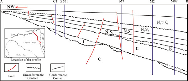 The Chunfeng oilfield is located in the northeastern Chepaizi High in the western uplift of the Junggar Basin, a short distance northwest of Zaire Mountain, and is connected to the Changji Sag to the east [12, 13]. It was the second oilfield discovered since the Shengli oilfield began dominating the West New Area (Fig. 1). According to the drilling results (Fig. 2), the rocks in the Chepaizi High, from their bottom to top, belong to the Carboniferous, Jurassic, Cretaceous, Paleogene, Neogene Systems and Quaternary systems [14, 15]. Carboniferous rocks constitute the entire basement of the Junggar basin. No wells have reached the bottom of the Carboniferous System. The Tugulu group of the Cretaceous and Neogene Systems is widely distributed [16, 17]. The Jurassic System is distributed locally and constitutes eroded debris deposited in gullies incised in the Carboniferous System. The formations above the Cretaceous System overlap in upward-sloping steps in the northwest direction. The Neogene System contains Shawan, Taxihe and Du Shanzi Formations, and the lithology is an unequally proportioned between glutenite and mudstone. The Shawan Formation is widespread in the Chepaizi area and thins until it pinches out towards the northwest; however, the thickness in the southeast can exceed 400 m. The Shawan Formation presents a discordant on-lap contact with the Taxihe Formation and uncomfortably overlies the Paleogene System based on a seismic cross-section. The Shawan Formation can be divided into three sections based on its lithology: the Sha-1, Sha-2 and Sha-3 sections. The Sha-2 and Sha-3 sections are composed of thick mudstone and siltstone and lack calcareous interlayers. The Sha-1 section, which has been heavily studied, consists of thick light-gray pebbly sandstone, gray gravelly and pebbly sandstone, and thin mudstone, and calcium cementation phenomena are common [13].