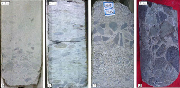 The cores Fig. (3) indicate that the calcium-cemented portions of the reservoir are pale, that the retrieval rates of the cores are high, and that the cores are relatively complete and are finer and tighter than the portions cemented by argillaceous minerals. The calcium cements are composed mainly of calcium carbonate, and these materials exhibit a clear blister phenomenon after the application of a drop of dilute hydrochloric acid. The calcium-cemented portion of the reservoir consists of conglomerates, gravelly sandstones and conglomeratic sandstones. The sediment grain size is generally coarse, can appear in any position in a rhythmic set of beds, and is easily recognized.