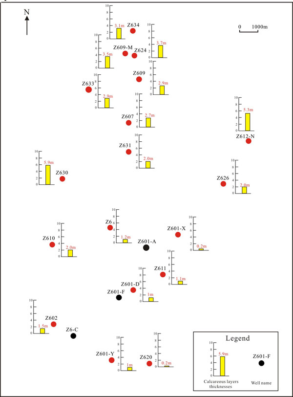 We measured the thickness of the calcareous interlayers in typical wells and found that the number of calcareous interlayers generally ranges from 0 to 4. The cemented layers make up a greater total thickness than the noncemented layers and have an average thickness of 2.34 m. Many calcareous interlayers are thicker than 1 m, which can block oil and gas seepage, and accounted for 89% of the total. The thickest calcareous interlayers were approximately 5.9 m. The wells containing more calcareous interlayers are generally located in the northwest portion of the basin near the sediment source, and most of these wells contain more than two layers, whereas the wells in the southeast generally contain fewer than two layers. The calcareous interlayers distinctly thin to the southeast (Fig. 4). For example, the target layer in well Z601-X in the southeast contained no distinct calcite-cemented interval, whereas well Z624 layer, in the northwest, contained four layers: one approximately 1 m thick near the top, another approximately 1.5 m near the bottom, and 2 layers in the middle with thicknesses of 1 m and 0.2 m.