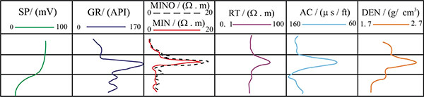 The conventional well logging curves of the calcareous interlayers indicate that the spontaneous potential (SP) curve is near the shale line, the resistivity (RT) curve displays high values, the microelectrode logs (including the micronormal and microinverse logs, or MINO and MIN curves, respectively) display high values and no or little separation, the density (DEN) curve displays high values, and the acoustic (AC) curve clearly displays low values. In addition, the calcareous interlayers in the study area are characterized by high values on the gamma ray (GR) curve, and compared with other features, this log provides important clues for the analysis of calcium glutenite layers in the study area. For example, the shape of the electric log from well Z609-D shows typical identification marks (Fig. 5).