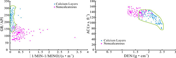 We selected 230 rock logging data points from 25 cored wells and generated response parameter cross-plots (Fig. 6). The five sensitive logging parameters for deriving the calcareous interlayer identification chart were ranked as follows from highest to lowest priority: GR, MIN, MINO, AC and DEN. The dividing line between the presence and absence of calcareous interlayers is clear; therefore, this chart can be used to identify calcareous interlayers. The characteristics for the identification logging parameters are listed below.