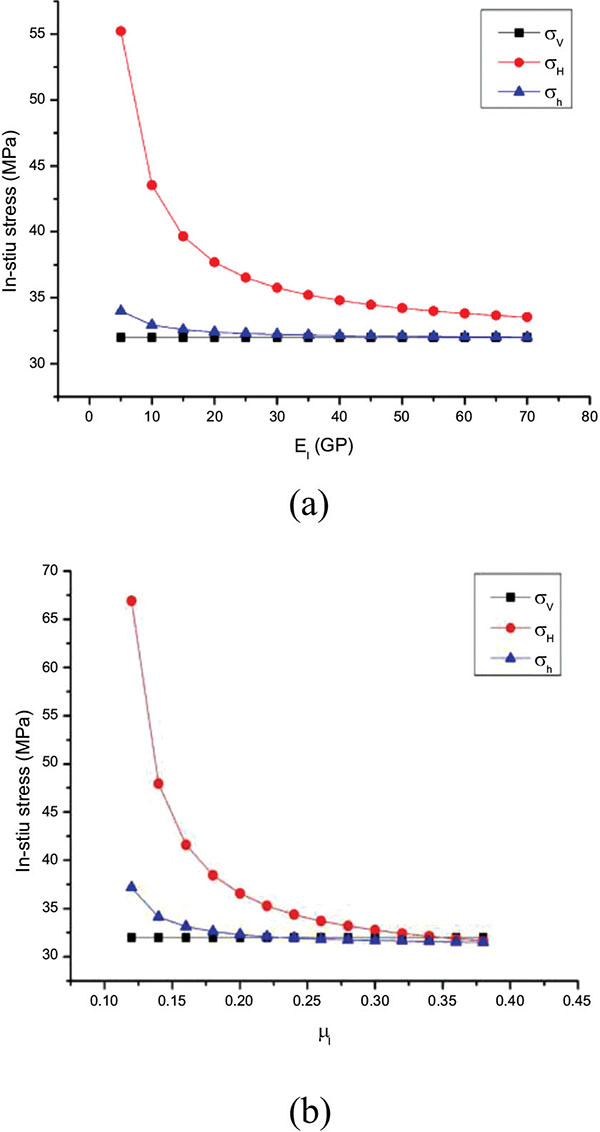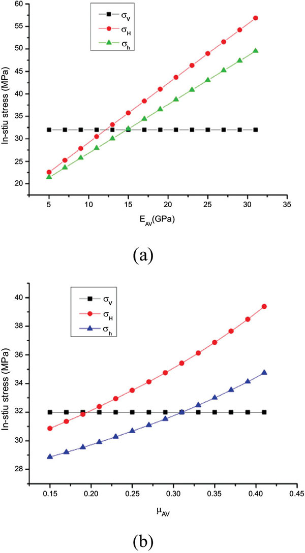 With the increased elastic modulus of parallel vertical bedding direction, the in-situ stress of two horizontal directions was decreasing exponentially and the decrease rate of the minimum horizontal geostress was bigger, as shown in Fig. (4a). With the Poisson's ratio increased, the geostress of the two horizontal direction was increased linearly, the growth rate of two horizontal geostress is similar as shown in Fig. (4b).