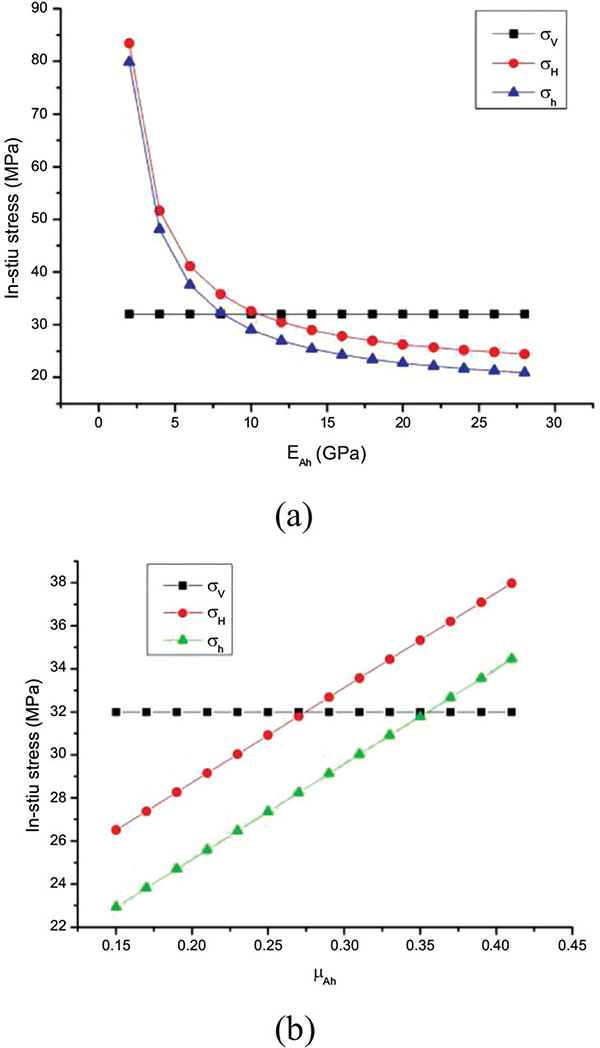 With the elastic modulus and Poisson's ratio of the vertical bedding direction increased, the in-stiu stress of two horizontal directions increased linearly as shown in Fig. (3a). With the increased Poisson's ratio, the geostress of two horizontal direction increased exponentially. The growth rate was higher for the maximum horizontal geostress. The difference between two horizontal geosterss increases gradually as shown in Fig. (3b).