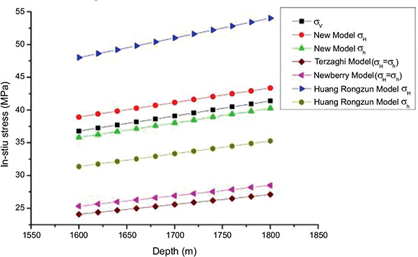 Without considering the influence of tectonic stress, the calculation result of geostress by Terzaghi and Newberry model was lower. In the Huang Rongzun model, only considering the effect of Poisson's ratio, it was concluded that the maximum horizontal geostress value was larger and the minimum horizontal geostress value was smaller without the effect of elastic modulus. The new model considered the influence of Poisson's ratio and elastic modulus simultaneously. Thus, the calculation results were in the range of the results of Huang Rongzun model.