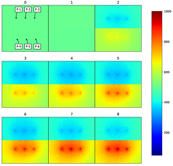 The estimated permeability distribution is different from true model since the algorithm only assimilates few data, which is single well for each facies. If measurement data is added, the estimated permeability would be much closer to true model. For example, if we add additional wells to the previous model, the permeability RMSE error is reduced into 189.45 md, which makes it closer to true model (Fig. 13).