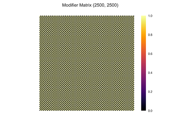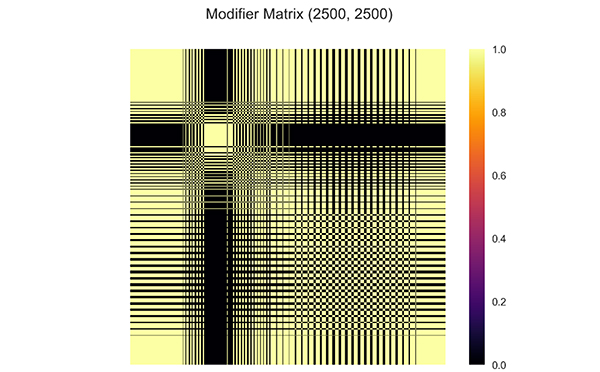 Fig. (18). Heatmap of modifier matrix generated by equation (5) for channelized facies model. The correlation from different facies is removed. |