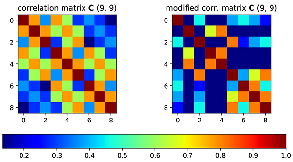 Fig. (2). On the left side, correlation matrix is generated by Gaussian correlation model. On the right side, correlation matrix has been modified by region modifier. |