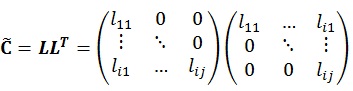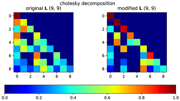 The initial correlation matrix is generated using Gaussian correlation model. From color representation, it is clearly shown that the correlation value is decreased when the distance between grid is increased. After correlation matrix is obtained, the correlation matrix is factorized using Cholesky Decomposition as Fig. (3).