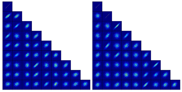 Fig. (3). Lower triangular matrix of original correlation matrix (left) and modified correlation matrix (right). |