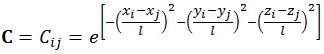 The variables x, y, z represent grid numbers in Cartesian axis in x, y, and z direction, respectively. Variable l expresses the correlation length, while the dummy indexes i, j are the grid indexes under corresponding Cartesian axis x, y, and z. The correlation length could be derived from variogram analysis performed during the static modeling process. It can be inferred from equation (4) that adjacent grids will have strongest relationship, illustrated with highest correlation value amongst them. However, the situation will not always follow this basic rule, particularly when the grids are under different region models such as facies, rock type, or flow unit. To address this problem, we modify the Gaussian correlation by introducing matrix modifier term (F) defined as: