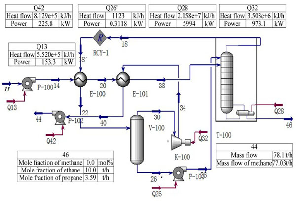 The LH separation process, which is disclosed by Patent 7069743B2 US [8], contains three to four heat exchangers. The use of the heat exchange equipment avoids the extra refrigeration of the reflux liquid. This helps reduce the heat input of the distillation column and the system energy consumption with high ethane recovery rate. However, the NCP is limited by making use of a compressor to increase the pressure of rich methane gas, which leads to a raised energy charge. The LH separation process of NCP is shown in Fig. (2).