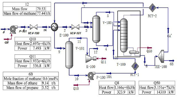 In the simulation of four different LH separation processes, a unified outer transportation pressure of a natural gas product is set up. Because the operating pressure of the demethanizer is the main factor for determining the separation efficiency and energy consumption of LH separation, the four LH separation processes were carried out under different pressures (2~4.5MPa), and through such definition, the effects of the operation pressure and separation process on the separation efficiency and system energy consumption can be comprehensively analyzed and compared. The demethanizer simulation conditions of the four studied LH separation schemes are listed in Table 2. Where RE1″ and RE2″ stand for the feed position (from top to down) of the two streams of reflux liquids respectively for demethanizer in each schemes.