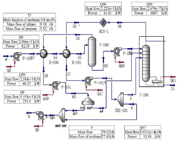 The LH separation process of PSP is shown in Fig. (4). The feed LNG goes successively through the direct contact heat exchanger E-100, E-101, and heat transfer with, respectively, the methane rich gas from the top of the separator V-100 and the methane rich vapor from the top of the distillation column, and then, it flows into separator V-100 for gas-liquid separation. The liquid which mainly contains heavy hydrocarbon from the bottom of V-100 flows into the distillation column after being pumped. At the top of the separator, the methane rich gas, which is separated from the top of the separator, is pressurized to the operating pressure of the distillation column after the feed LNG is preheated. Part returns to the distillation column as the flux liquid, and the rest flows into the gasification unit. The system operates under 3~3.06 MPa. Additionally, a high concentration of methane vapor is obtained at the top of the distillation column, and it is completely liquefied after the feed LNG is preheated. After being pumped to the operation pressure of the distillation column, part returns to the distillation column as the flux liquid, and the rest flows into the gasification unit. The NGL which mainly contains heavy hydrocarbons is obtained in the bottom of the distillation column.