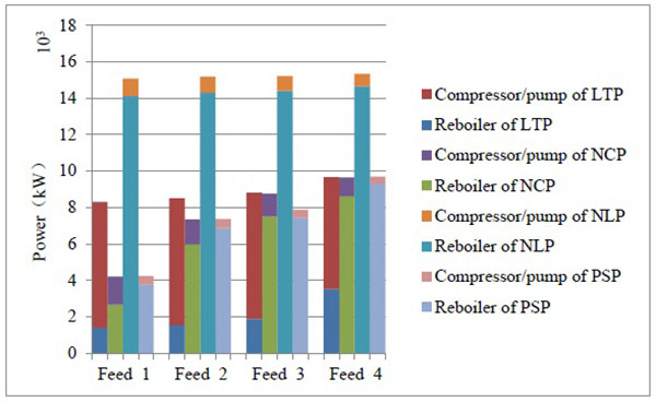 A comparative analysis was made between the energy consumption of PSP and the consumptions of LTP, NCP, and NLP, individually. The distillation column and the product external transport pump/compressor are the main energy consuming units in the LH separation process. The power comparison of the compressor/pumps and boilers of the four LH separation schemes are shown in Fig. (5).