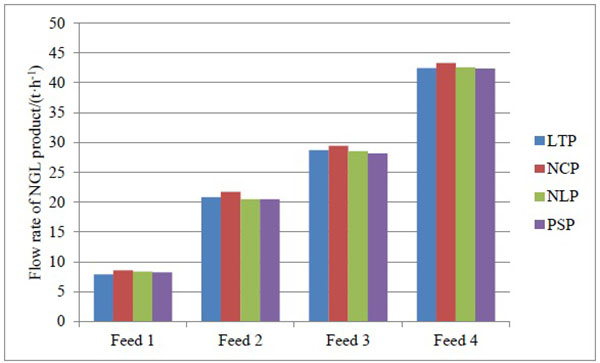 The flow rate comparison of the NGL product for the four types of LH separation schemes is shown in Fig. (6). The comparison results reveal that for one type of LH separation scheme, with an increase in the heavy hydrocarbon component in the feed LNG, the flow rate of the NGL product is increased. For the same feed components, the NGL production of the four schemes is basically the same, and the NCP has the highest NGL production. Because the reflux liquid is composed of the gas from the top of the distillation column for NCP, it is obvious that the reflux liquid mainly contains ethane and propane. The ethane and propane are absorbed in the column, and the heavier hydrocarbons (butane and heavier components) directly flow out from the bottom of the distillation column.