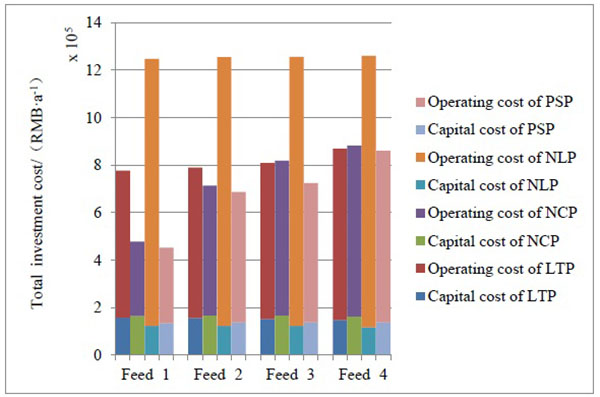 The total investment cost consists of the capital cost and operating cost [13]. A comparison of the total investment cost for each LH separation process is shown in Fig. (7). The comparison result reveals that the main decisive factor of the total investment cost is the operating cost, and PSP has the lowest total investment cost.