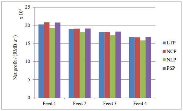 The net profit and total investment cost are two important indicators to measure the quality of a process. The net profit is equal to the after tax annual income (25%) minus the total investment cost [13]. The investment recovery period is the ratio of the total investment cost and net profit. The comparison of the net profit for each process is shown in Fig. (8). And the net profit data for each process are shown in Table 3.
