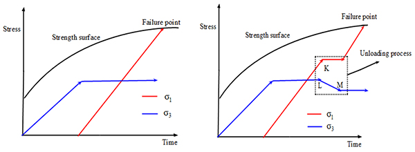 For triaxial test in conventional and unloading condition, stress paths of core sample are demonstrated in Fig. (10). In conventional condition, the stress path is that σ3 is firstly loaded to a certain value, then σ1 increases until core sample failures, shown as Fig. (10a). In unloading case (Fig. 10b), the first step is the same that σ3 increases to a constant value. Subsequently, σ1 is loaded to the 80% of triaxial compressive strength (Point K). With the constant σ1, unloading process begins, and σ3 is unloaded from point L to M. When unloading process ends up, σ1 increases again and stops until rock failure. The stress difference between point L and point M is the unloading range. Based on those 2 types of triaxial tests, the shale strength with and without going through unloading can be obtained.