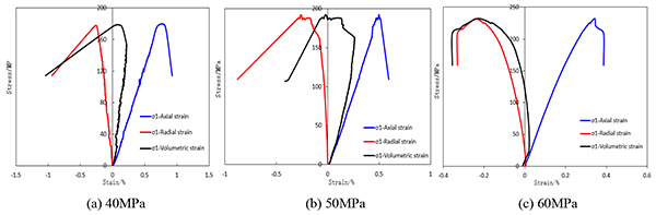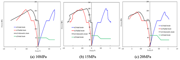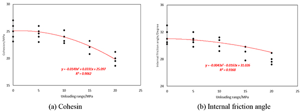 Fig. (14) indicates that (1) Cohesion and internal friction angle show similar dropping tendency with unloading range. Both mechanical parameters decrease slowly in the small unloading range. When unloading range is over 10MPa, this dropping rate becomes big. (2) With the same unloading range, cohesion gets larger decline compared to internal friction angle. For instance, when unloading range is 20MPa, the decreasing range of cohesion and internal friction angle are 18.5% and 6.1% respectively. Thus, it can be concluded that unloading has relatively stronger impact on cohesion. (3) Based on experimental data, curve fitting has been performed to establish relation between unloading range and mechanical parameters, written as Eq. (2).