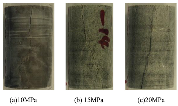 Wellbore stability analysis is based on rock mechanical property. To achieve the influence of unloading on clay-rich shale strength, firstly triaxial test is applied to obtain clay-rich shale mechanical property in conventional condition, shown as Figs. (2-4). It can be seen that (1) the shape of stress-strain curves in different confining stress is similar, but the strain is small in high confining stress condition. This is because that confining stress offers lateral bracing and imposes restrain on rock deformation. (2) This lateral bracing is able to enhance rock strength, and triaxial compressive strength increases with rising confining stress, showing clear linear correlation. (3) Core samples after failure illustrate that in different confining stress, failure mode of clay-rich shale has no obvious change and still is single shear failure mode, which is slipping break along with one failure plane.