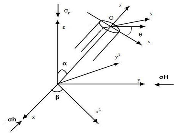 When borehole is un-drilled, stress state of rock around wellbore is only controlled by in-situ stress [12]. Given an arbitrary borehole, through coordinate transformation Fig. (15), in-situ stress components in wellbore coordinate system can be expressed as Eq. (3).