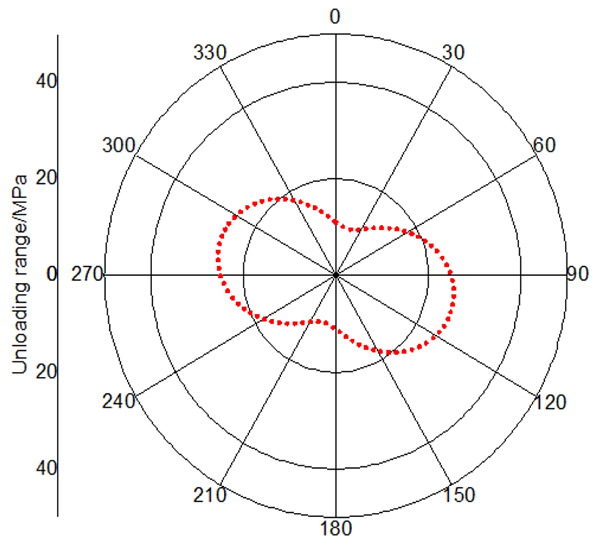 Before drilling operation, for a given point in the wall of borehole (Point P in Fig. (16)), rock is loaded by σxx and σyy in the wellbore plane. By stress decomposition, the stress (σn) along with radial direction of borehole can be expressed as Eq. (6). After drilling, the rock in the borehole is removed and stress along with radial direction of borehole is changed to mud pressure (σr = pi−δϕ(pi − pp)). Therefore, the unloading range along radial direction at the wall of borehole can be given on the basis of σn and mud pressure, shown as Eq. (6). In particular, given the certain well trajectory, the whole distribution of unloading range is illustrated in Fig. (17).