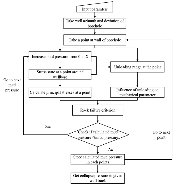 Using the stress state around wellbore, we can achieve principal stress at given point in wall of borehole, shown as Eq. (7) [13]. Additionally, the maximum and minimum principal stresses at that point can be obtained by making comparison among these principal stresses. According to principal stresses, considering the influence of unloading on rock strength (Eq.(2)), failure criterion with unloading can be acquired on the basis of Mohr-Coulomb criterion, shown as Eq. (8). The whole computed process of this wellbore stability model is illustrated in Fig. (18).
