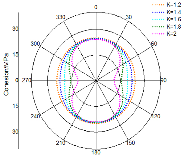 Anisotropy is the characteristic of formation, and especially the anisotropy of in-situ stress has obvious impact on wellbore stability [14]. Hence, to investigate the influence of unloading in variable anisotropy condition, the anisotropy coefficient is defined as ratio of maximum and minimum horizontal principal stress, written as Eq. (9). Take vertical well as an example, minimum horizontal principal stress and vertical stress remains constant (σh = 42MPa   σv = 72MPa).With different anisotropy coefficient, the distributions of cohesion and internal friction angle at the wall of borehole are illustrated in Figs. (19 and 20) respectively.