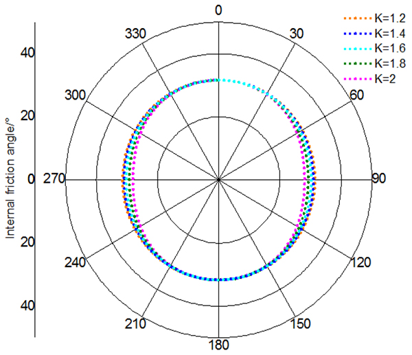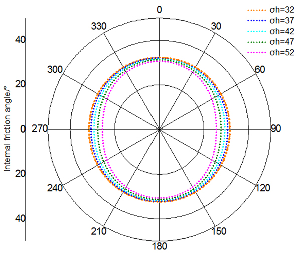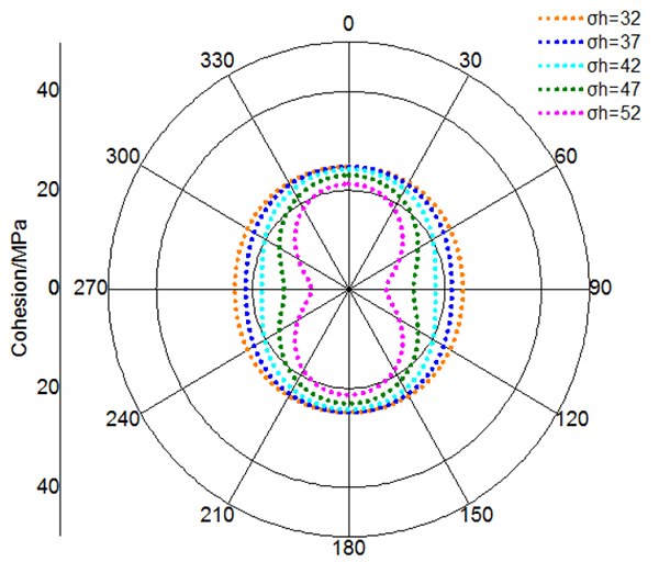 In different geologic situation, the value of in-situ stress is variable. Existing studies have proved that value of in-situ stress is a significant influence factor of collapse pressure [15]. Thus, with the constant anisotropy coefficient (k=1.4) and vertical in-situ stress (σv = 72MPa). Mechanical parameters in different value of in-situ stress are demonstrated in Figs. (22 and 23). It is noticed that mechanical parameters have bigger decline in high value of in-situ stress, and in comparison with cohesion, internal friction angle is less affected by unloading. Besides, strength declined made by unloading is variable around the wall of borehole. The maximum strength decline occurs at 90 degree and 270 degree circumferential angle. In contrast, the points of minimum strength decline are located in 0 degree and 180 degree circumferential angle.