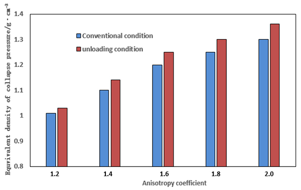 In addition, based on the strength decline caused by unloading, collapse pressures with variable anisotropy coefficient are obtained in conventional and unloading condition, shown in Fig. (21). It can be found out that collapse pressure rises with increasing anisotropy coefficient. Also, in comparison with collapse pressure in conventional condition, collapse pressure in unloading condition is larger. This difference increases with growing of anisotropy coefficient, indicating that unloading has stronger impact on collapse pressure in the formation with high anisotropy coefficient.