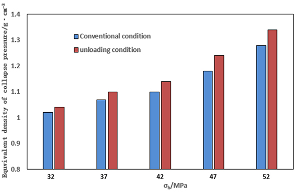 Meanwhile, Fig. (24) presents collapse pressures with various value of in-situ stress in conventional and unloading condition. It is shown that safe density is elevated with value of in-situ stress, and unloading causes more increment of collapse pressure. In particular, this increment is larger in high value of in-situ stress, showing that unloading has stronger influence on wellbore stability in high in-situ stress formation.