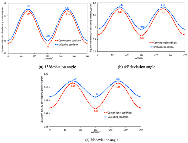 During drilling process, stress state around wellbore changes due to unloading. In different in-situ stress condition, influence of unloading varies. In strong anisotropy and high value of in-situ stress, unloading has relatively stronger impact on rock strength, thus causing larger increment of collapse pressure. Meanwhile, well trajectory is associated with unloading effect. With increase of deviation angle, the increment caused by unloading is large and collapsing pressure grows gradually, which means that vertical well is most stable and less affected by unloading. With the constant deviation angle, the difference of collapse pressure in conventional and unloading condition reach peak point in the azimuth toward minimum horizontal principal stress.
