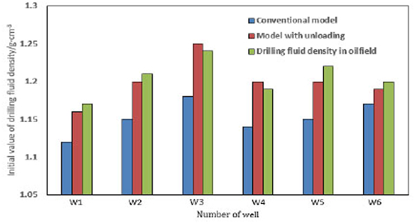 As mentioned above, unloading occurs in the beginning of drilling, causing impact on the wellbore stability, especially for determining the initial mud pressure. The model in this paper made an attempt to consider unloading into prediction of initial mud pressure. To verify its practicability, this model has been applied to 6 wells in clay-rich shale formation, Northern China. The drilling loggings of 6 wells show that there is no borehole collapse in the beginning and ratio of well expanding are all less than 12%, which indicate that these initial drilling fluid densities of 6 wells are practical for stabilizing wellbore in clay-rich shale formation. Based on that, wellbore stability model with and without considering unloading are used to predict the collapse pressure, shown as Fig. (26). It demonstrates that conventional model without unloading has clearly lower drilling density, which is not safe for drilling operation. On the contrary, results of model having unloading impact is close agreement with oilfield data and only has average deviation less than 6%, proving its ability of accurately predicting collapse pressure in the initial stage of drilling in clay-rich shale formation. Therefore, this model can be regarded as a viable tool for choosing appropriate initial mud pressure in drilling.