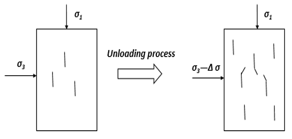 When confining stress is unloaded, the stress state of core samples changes. This influence of unloading on core samples is illustrated in Fig. (5). Because of the unloading (Unloading range is Δσ), lateral bracing decreases, leading to axial stress (σ1) having stronger compressive effect on core samples. This compressive influence will cause the production of new cracks and existing crack propagation [8-9]. It is apparent that these changes of rock structure directly affect rock mechanical property.