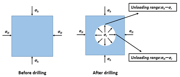 In drilling operation, unloading occurs around wellbore. To illustrate this unloading situation, we take vertical well as an example, illustrated in Fig. (6). Before drilling, stress state in formation is determined by in-situ stress. After drilling, the stress state of rock at the wall of borehole is changed because the rock in borehole was replaced by drilling fluid. In different position at the wall of borehole, the unloading range varies. For instance, unloading range are σhσr and σHσr respectively in the position of minimum horizontal stress (σh) and maximum horizontal stress (σH).