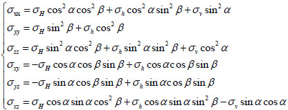 Where σxx, σyy, σzz, σxy, σyz, σxz are in situ stress components of the local wellbore coordinates, MPa. σH, σh, σv are maximum horizontal principal, minimum horizontal principal and vertical in-situ stress respectively, MPa. β is the azimuth angle of well, degree. α is the deviation angle of well, degree.
