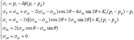 Where σr, σθ, σz are the radial, hoop and axial stress in wellbore coordinate, respectively, MPa. σθz, σ, σrz are the three components of shear stress, MPa. θ is wellbore circumferential angle, degree. v is Poisson’s ratio. α1 is Biot coefficient. pi is the mud weight in the wellbore wall, MPa. pp is pore pressure, MPa.