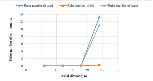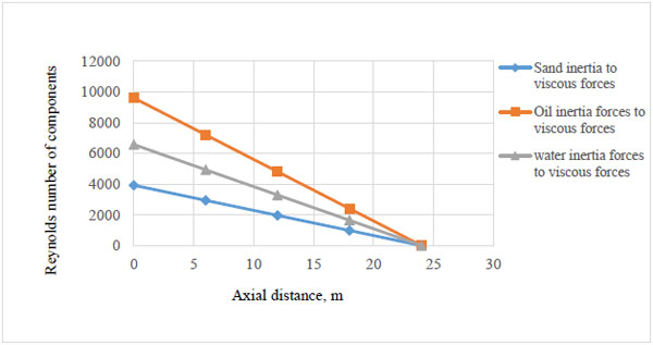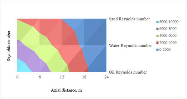 The Reynolds numbers of the components as shown in Fig. (4). decrease along the axial distance. This is as a result of the reduced velocities. As the velocities of the components decreased from the pipe inlet to the exit, corresponding reductions can also be seen for the three components. However, oil being the lightest of the three components showed the least reduction in Reynolds number while that of water was higher with sand having the lowest Reynolds numbers along the pipe axis.