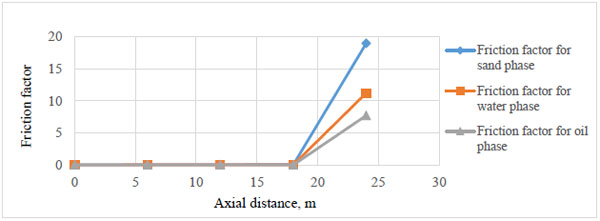 Fig. (3). Friction factor for sand, oil and water along the axial distance. |