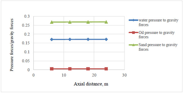 Fig. (5). Ratio of pressure to gravity forces for oil, sand and water along the axial distance. |
