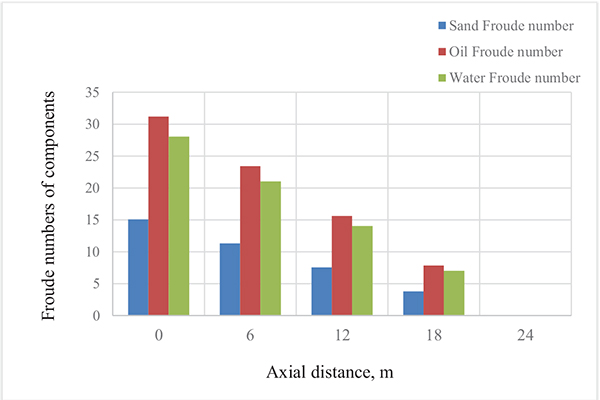 Fig. (6). Froude number of oil, sand and water along the axial distance. |