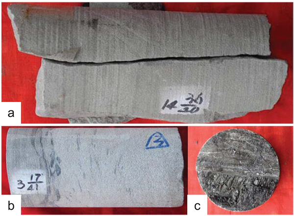 (Fig. 3) Core photos demonstrating sedimentary characteristics of rocks. (a) HH105 well, Chang 812, 2262 meters, fine sandstone of parallel bedding, high-angle fracture. (b) HH49 well, Chang812, 2283 meters, mud gravel at the bottom of the sandstone, erosion surface. (c) HH105 well, Chang 812, 2259 meters, fine sandstone with coal line.