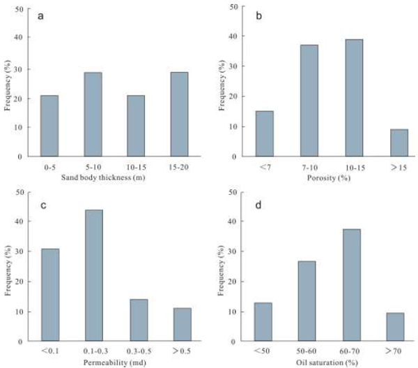 Based on a statistical analysis carried out for 10 wells in the study area (Fig. 1c), the sand body thickness in the Chang 8 member ranges from 2 to 20m, with 5–10m and 10–15m thicknesses being dominant values (Fig. 4a). Based on a statistical analysis of 208 core samples from 4 wells in the study area, the porosity of sandstone reservoir in the Chang 8 member ranges from 1 to 15%, 7 to15% being the dominant value (Fig. 4b). The permeability of sandstone reservoir in the Chang 8 member varies in range from 0.01 to 1.2×10-3μm2, with 0.1–0.3×10-3μm2 being the dominant vales (Fig. 4c). The oil saturation of sandstone reservoir in the Chang 8 member is in the range of 35–75%, with 60–70% being the dominant range (Fig. 4d).