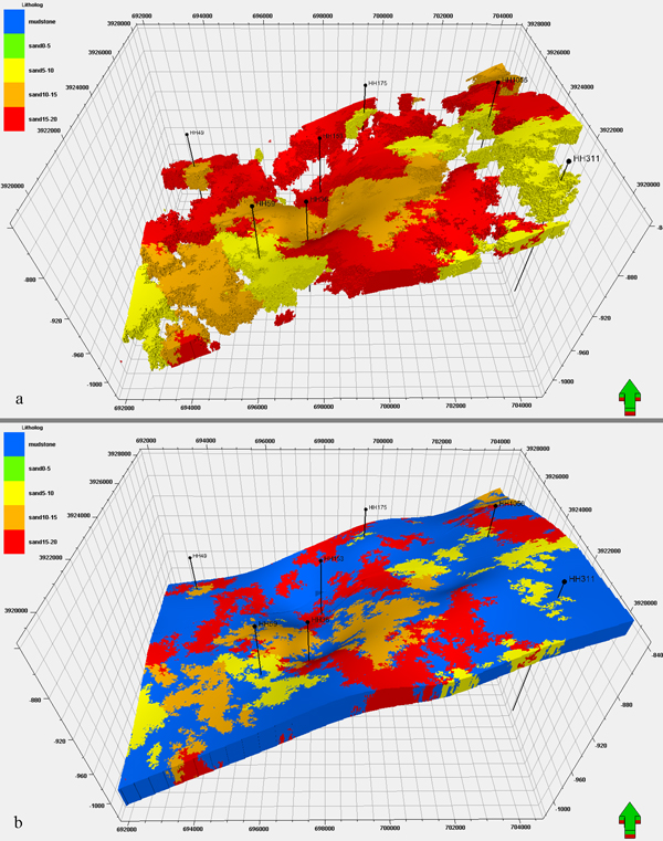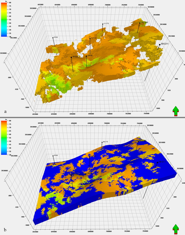 The reservoir geological modeling was carried out to establish an attribute model reflecting the characteristics of subsurface reservoir (sand body, porosity, permeability and oil saturation) spatial distribution. Attribute model should be calibrated with results of core analysis data [18, 19]. The conventionally deterministic modeling method with a few points interpolating may poorly reflect space change of the parameters of sand body, porosity, permeability, oil saturation, and heterogeneity and anisotropy of the distribution of subsurface reservoir. The geostatistics and stochastic simulation methods help to quantitatively describe spatial distribution of reservoir properties.