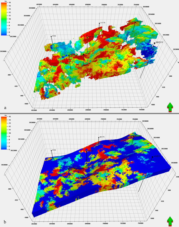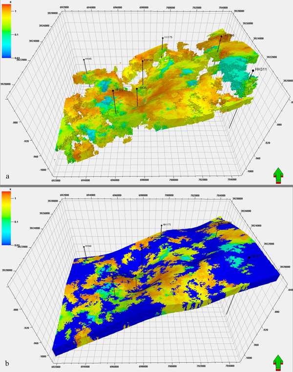 Permeability modeling method based on the sequential Gauss simulation method coupled with constraint of porosity (Fig. 8b).